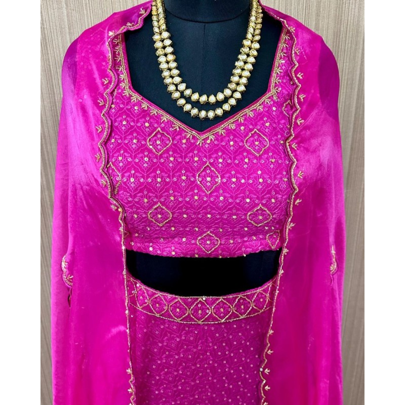 Elevate your style with our exquisite Chaikankari sharara set, impeccably paired with a hand-embellished organza cape. Embrace the allure of traditional craftsmanship and contemporary design as you step into this elegant ensemble. The intricate detailing and graceful silhouette make it a perfect choice for those special occasions where you want to make a lasting impression. Radiate timeless charm and sophistication with this captivating combination that effortlessly captures the essence of refined fashion. Sharara set perfection meets organza elegance, creating a look that is both graceful and on-trend.