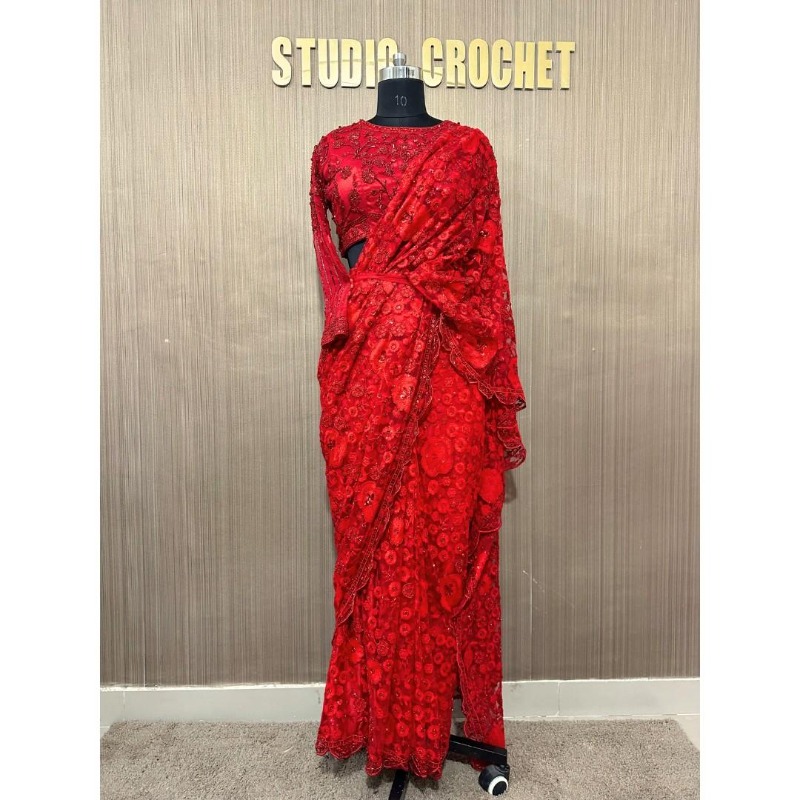 Indulge in regal elegance with our stunning red bridal saree, designed for the modern bride who seeks both style and comfort. This purely hand-embellished masterpiece captures the essence of heritage and royalty, transporting you to a realm of opulence and grandeur. Crafted with meticulous attention to detail, each intricate embellishment reflects the artistry of traditional craftsmanship, while the rich red hue symbolizes passion, love, and prosperity. Whether you're walking down the aisle or celebrating in style, this saree promises to make you feel like royalty, effortlessly blending tradition with contemporary flair. Elevate your bridal look with our easy-to-wear and sassy red saree, and embrace the timeless allure of royal elegance on your special day.
