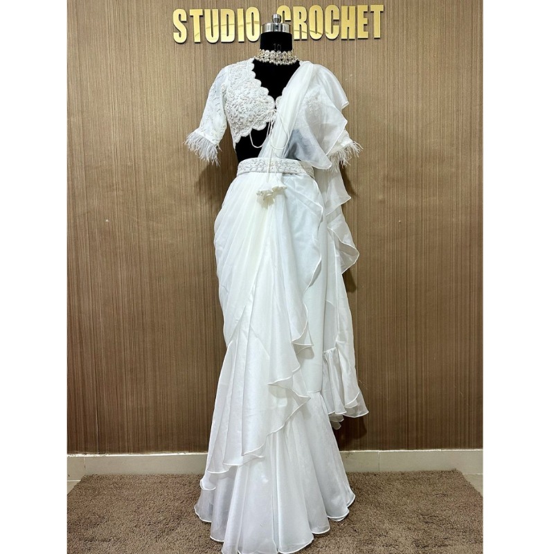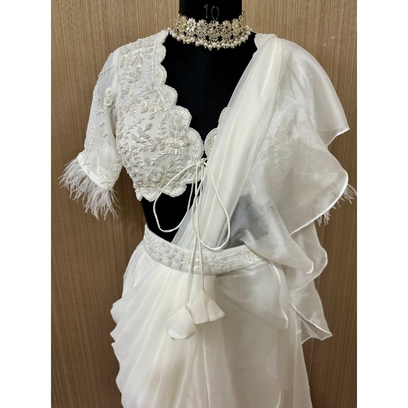 Step into the spotlight with our stunning ensemble featuring a scalloped, handcrafted ivory blouse, complemented by an elegant belt and saree. This meticulously crafted outfit is designed to make you the center of attention. Get ready to make a statement and embark on your next glamorous adventure. Get ready, get going, and captivate the world with your impeccable style.