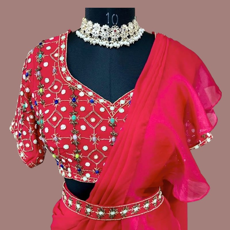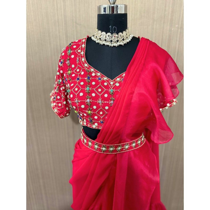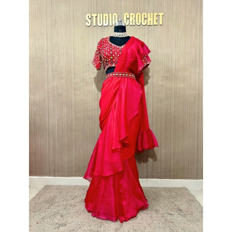 Embrace the allure of elegance in our crimson red draped ruffle saree, paired with a hand-embellished blouse and a chic belt. The cascading ruffles add a touch of drama to the traditional drape, creating a mesmerizing effect. The hand-embellished blouse complements the saree, enhancing its richness and sophistication. The addition of a stylish belt not only accentuates the waist but also adds a modern twist to the classic ensemble. This ensemble is a perfect blend of tradition and contemporary design, making it an ideal choice for special occasions. Indulge in the timeless charm of crimson red and the intricate details of hand embellishments, creating a look that is both timeless and modern. Elevate your style with this statement saree that promises to captivate attention and leave a lasting impression.