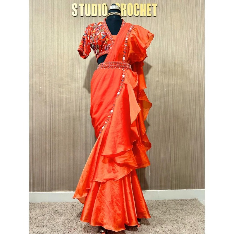 Elevate your wedding season wardrobe with our must-have ensemble: a stunning ruffle saree paired with a hand-embellished blouse and belt. This timeless combination exudes elegance and sophistication, perfect for any bridal affair or festive celebration. The ruffled saree adds a touch of drama and movement to your look, while the intricately embellished blouse and belt elevate the ensemble with luxurious detailing. Whether you're the bride-to-be or a distinguished guest, this outfit is sure to turn heads and make a lasting impression. Embrace the essence of timeless elegance and grace with our must-have ruffle saree ensemble for the wedding season.