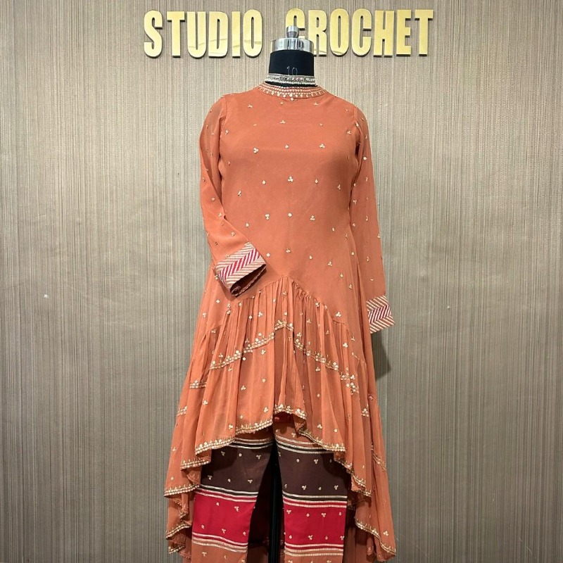 Elevate your ethnic wardrobe with our chic Rust Asymmetric Kurti paired with tonal-colored pants. Designed to make a statement, this ensemble combines contemporary style with traditional elements for a modern yet timeless look. The rust-colored asymmetric kurti features intricate detailing and a unique silhouette, adding a touch of elegance to your outfit. Paired with tonal-colored pants, this ensemble offers both comfort and style, making it perfect for casual outings, festive occasions, and everything in between. Whether you're attending a family gathering or a social event, this ensemble is sure to turn heads and make you the center of attention. Shop now and add a touch of sophistication to your wardrobe with our Rust Asymmetric Kurti and tonal-colored pants.