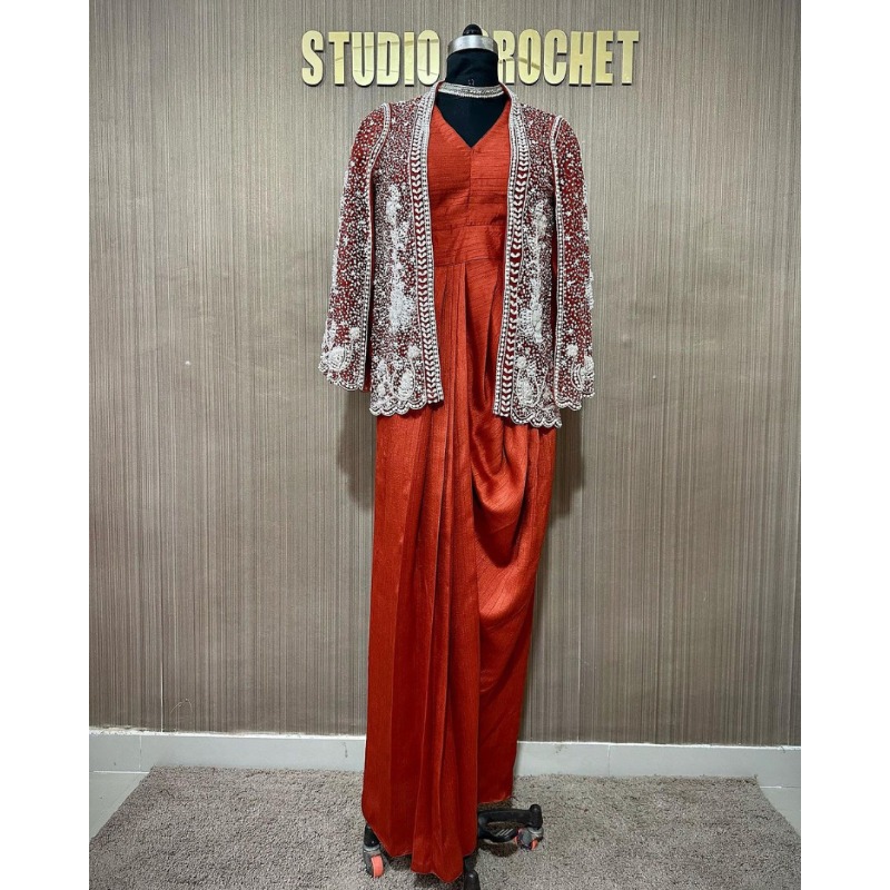 Elevate your style quotient with our stunning rust gown featuring an intricately hand-embellished iconic jacket. This ensemble is a perfect blend of traditional and contemporary, allowing you to showcase a sassy Indo-Western look. The gown exudes elegance, while the iconic jacket adds a touch of sophistication. Versatile and chic, the jacket can be paired with a lehenga for a playful and trendy twist. Embrace the fusion of cultures and make a bold fashion statement with this ensemble. Whether you're attending a wedding, a festive celebration, or a special occasion, this rust gown with its iconic jacket promises to make you stand out with grace and glamour.