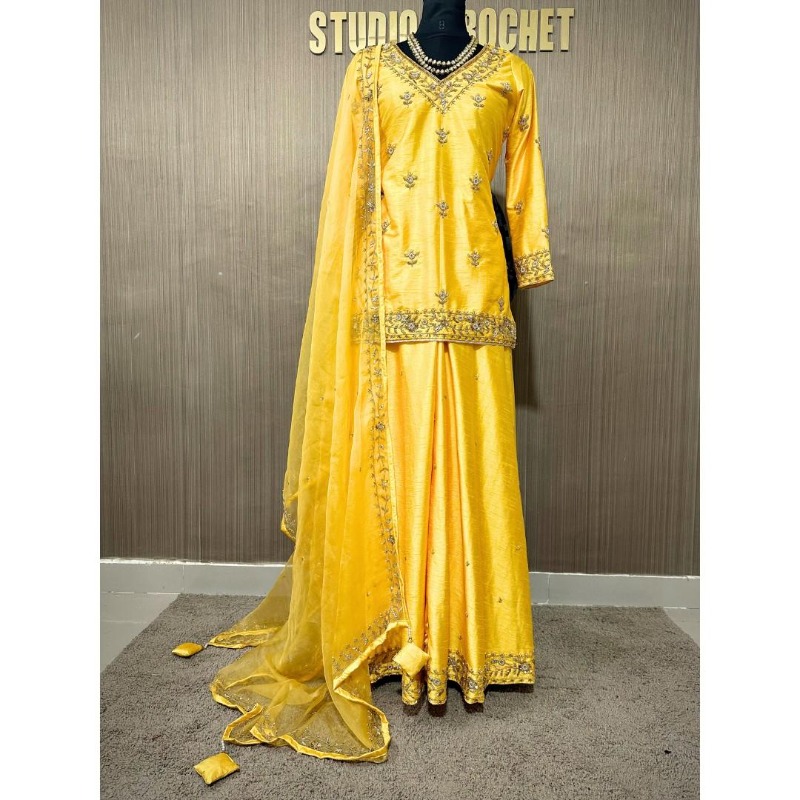 Indulge in the details that make your dream celebration truly unforgettable with our vibrant yellow sharara set! This stunning ensemble exudes elegance and charm, perfect for any special occasion. Crafted with meticulous attention to detail, the sharara set features intricate embellishments and delicate craftsmanship that elevate its beauty to new heights. Whether you're attending a wedding or a festive event, this ensemble is sure to make you stand out and radiate joy wherever you go. Embrace the love for vibrant colors and traditional elegance with our exquisite yellow sharara set.